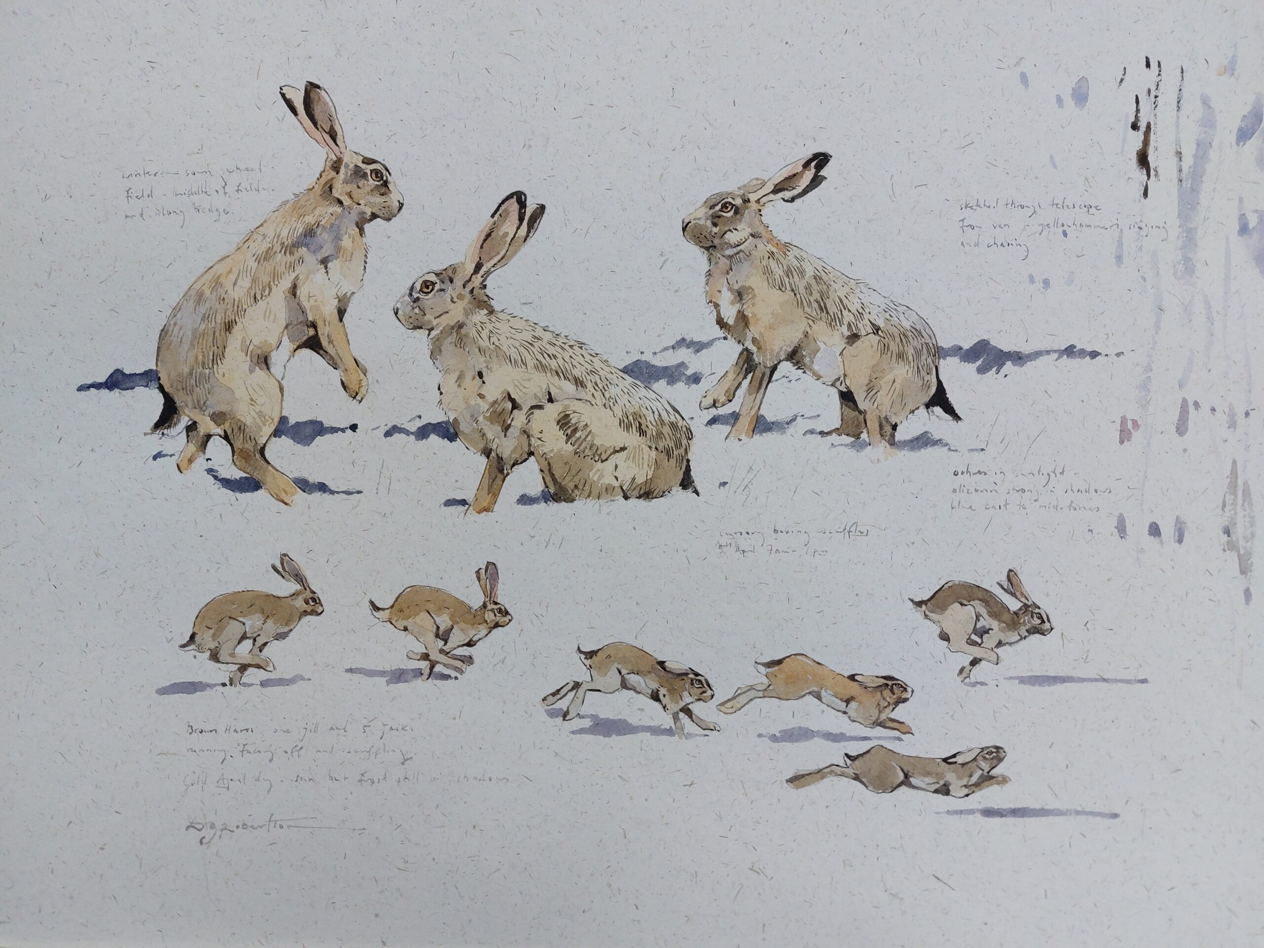 Brown Hare Field Sketches Original watercolour on spangled paper 50 x 60 cm framed £890 email Derek Robertson to purchase. Category: Wildlife Paintings Tags: hares, painting, watercolour