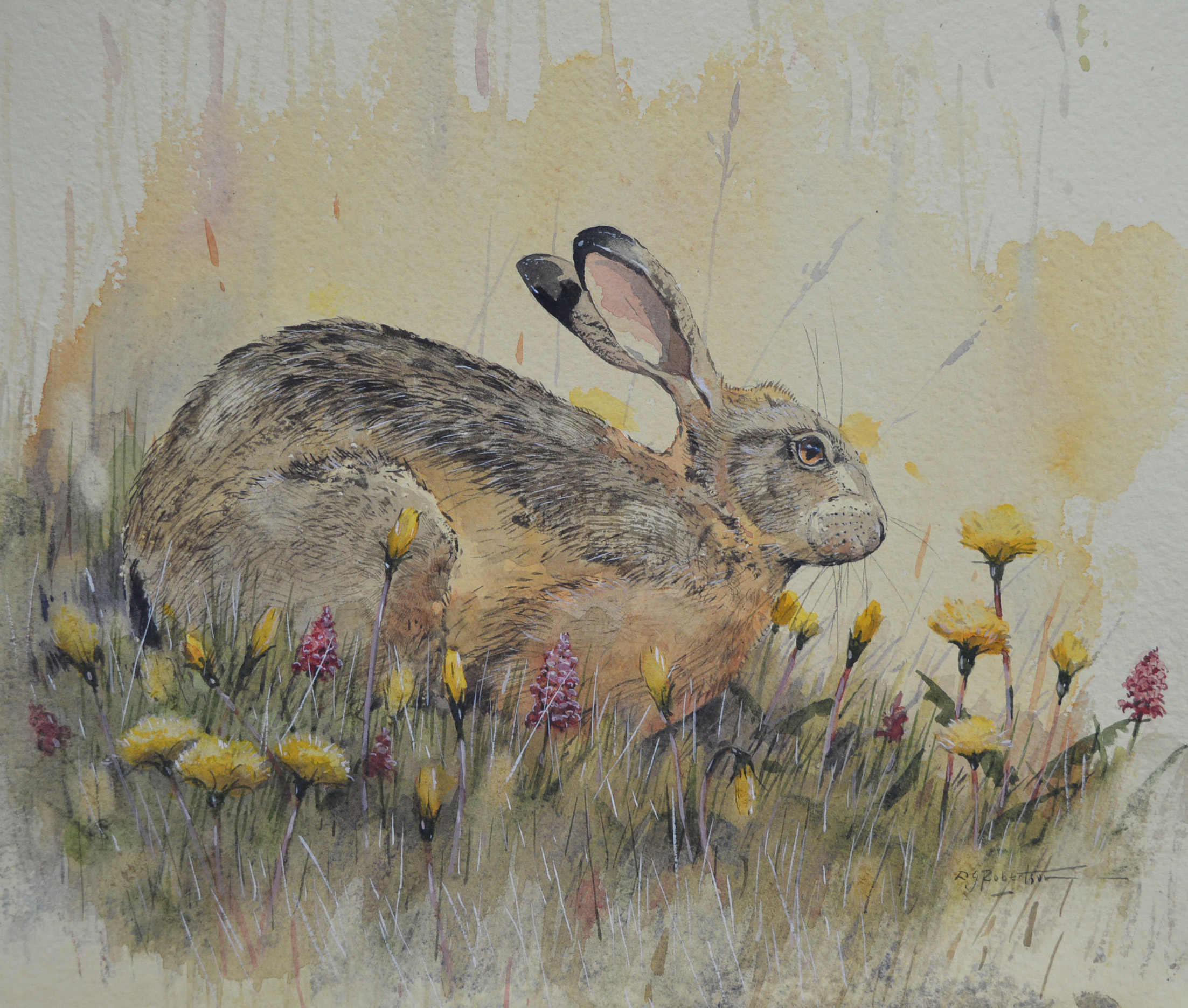 Dandy Hare Original watercolour on paper 60 x 50 cm framed £995 email Derek Robertson to purchase. Category: Wildlife Paintings Tags: hare, painting, watercolour