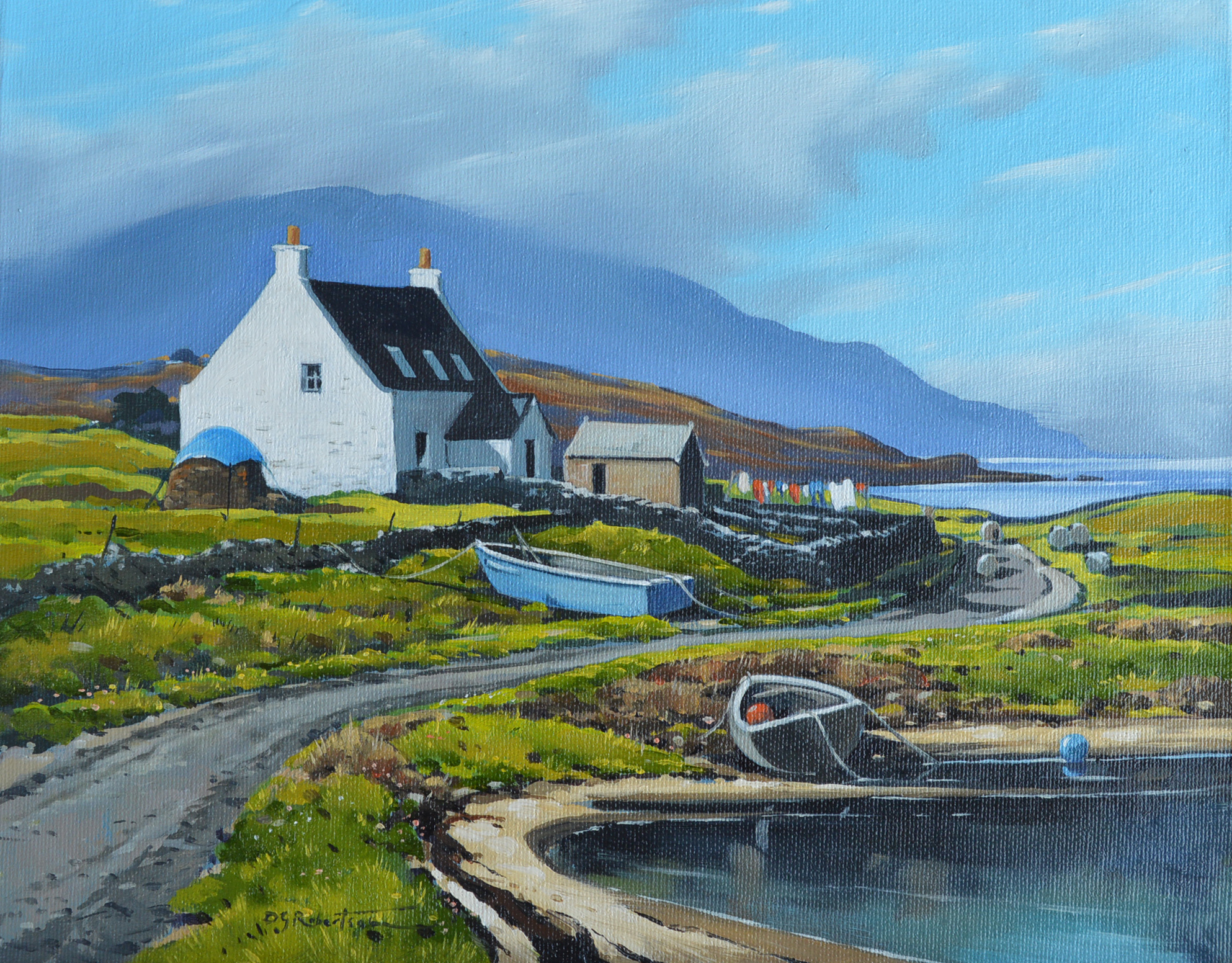 Drying Day, Canna, Scottish Hebrides Original oil on linen 45 x 50 cm framed £890 email Derek Robertson to purchase. Category: Landscape Paintings Tags: Hebrides, Landscape, oil, painting