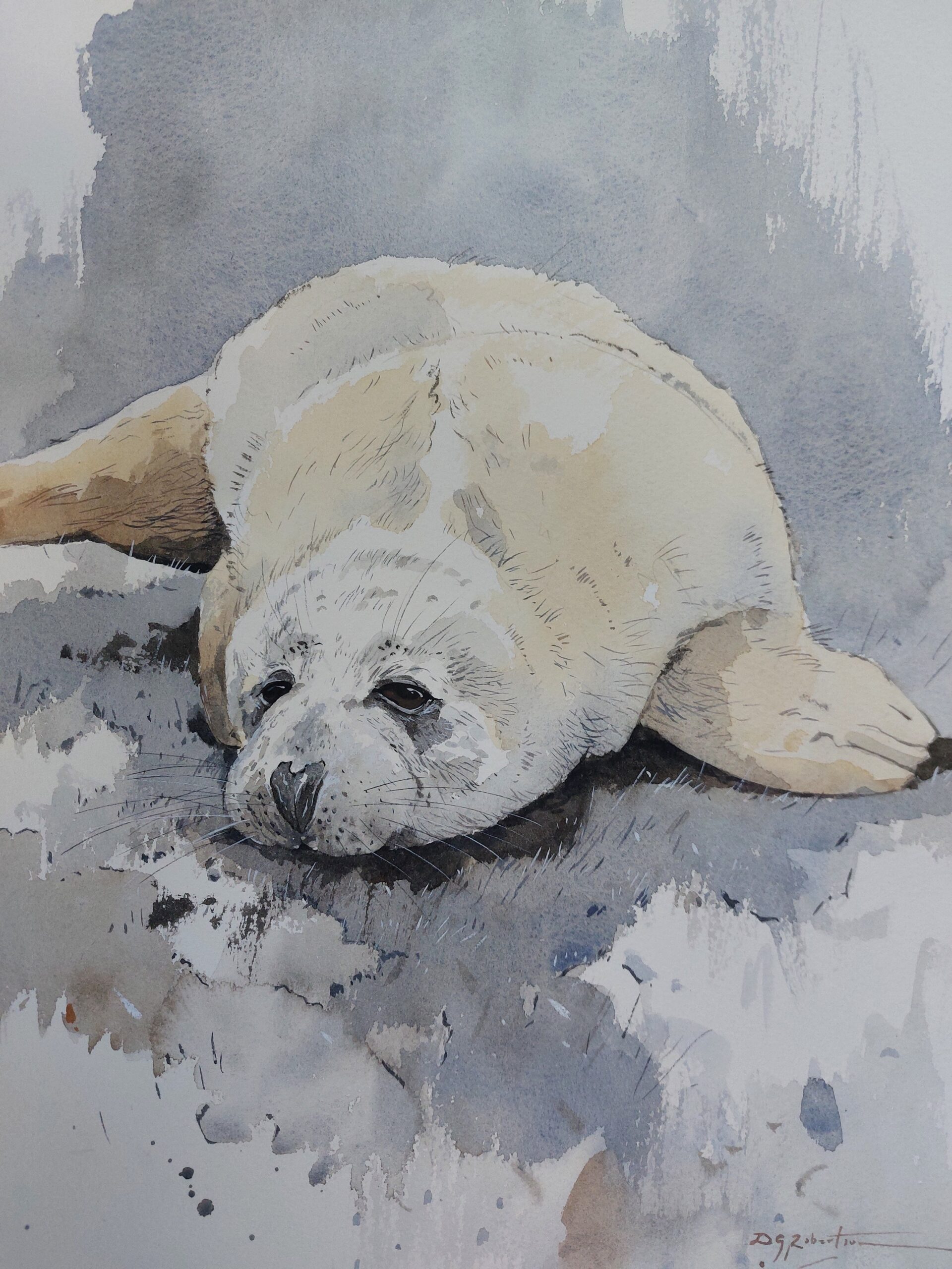 Seal Pup December Original watercolour 45 x 55 cm framed £890 email Derek Robertson to purchase. Category: Wildlife Paintings Tags: animal, painting, seal